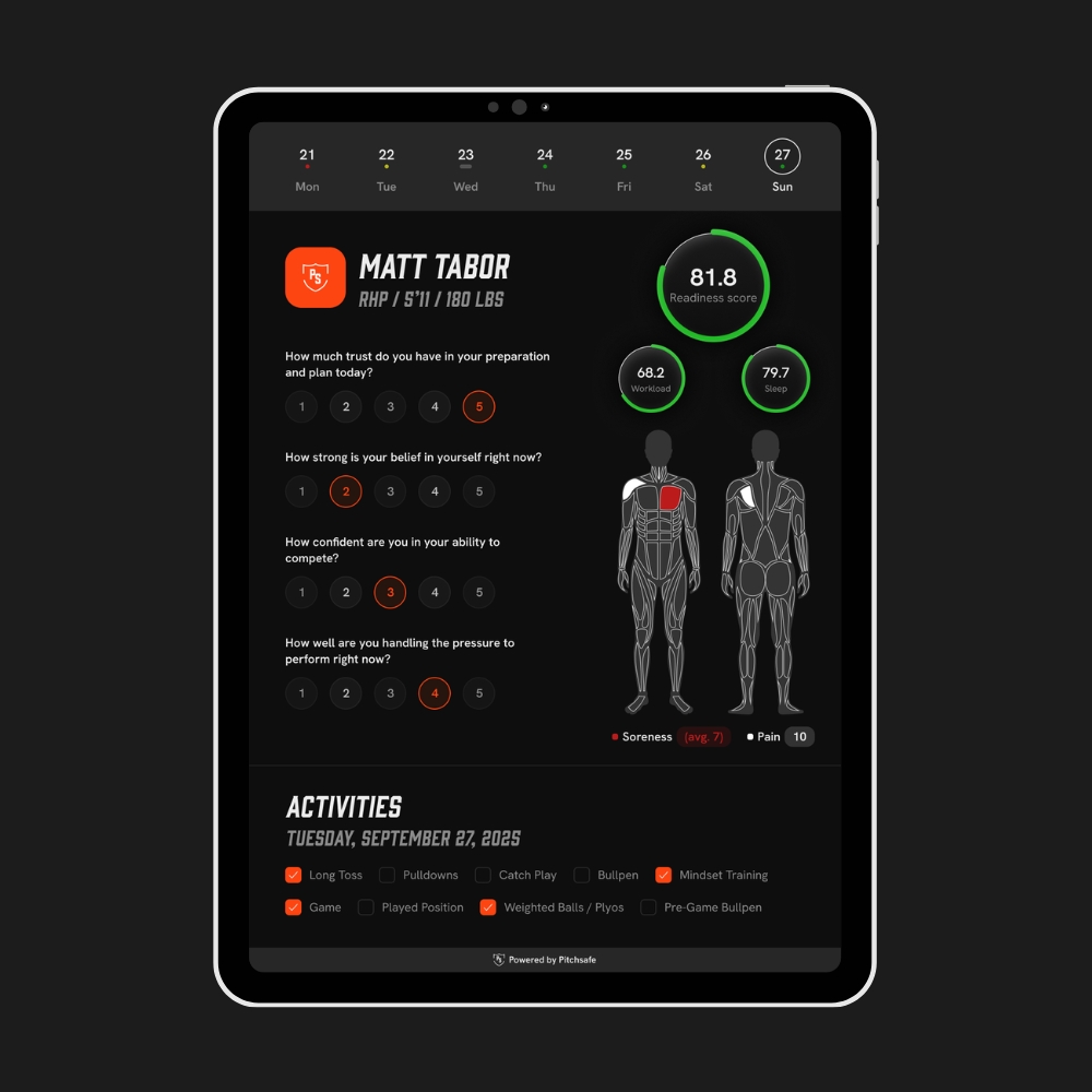 At Pitchsafe, we understand that your performance isn’t just about pitch counts and velocity readings. We take a caring, holistic look at his entire week—168 hours—to see where physical and mental demands might overlap. Whether it’s additional workouts, school responsibilities, or everyday stresses, these factors can build up and affect his arm health and overall energy levels.